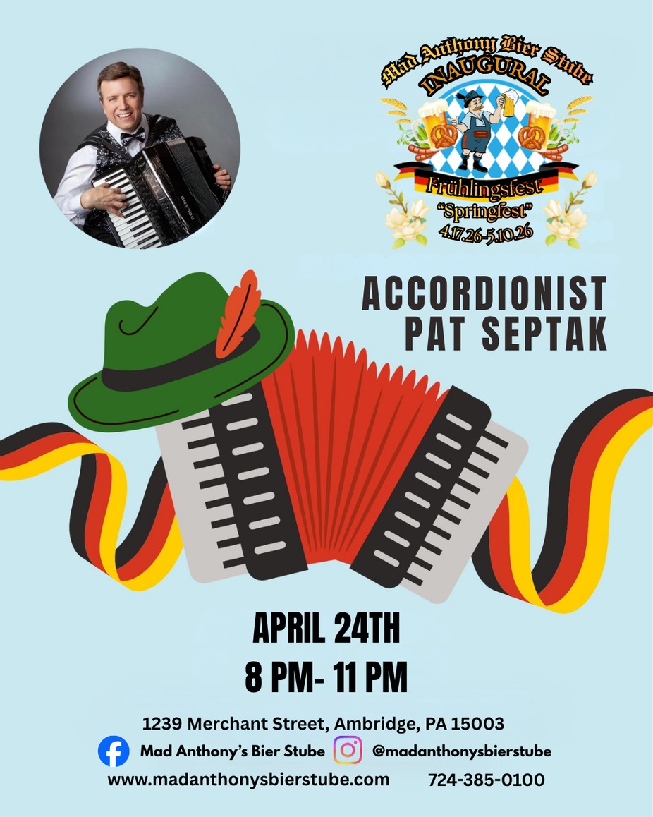 Let's Polka! Pat Septak will be strolling through the courtyard and the dining room with his accordion. Put on your lederhosen, dirndls, and dancing shoes, and get ready to twirl!