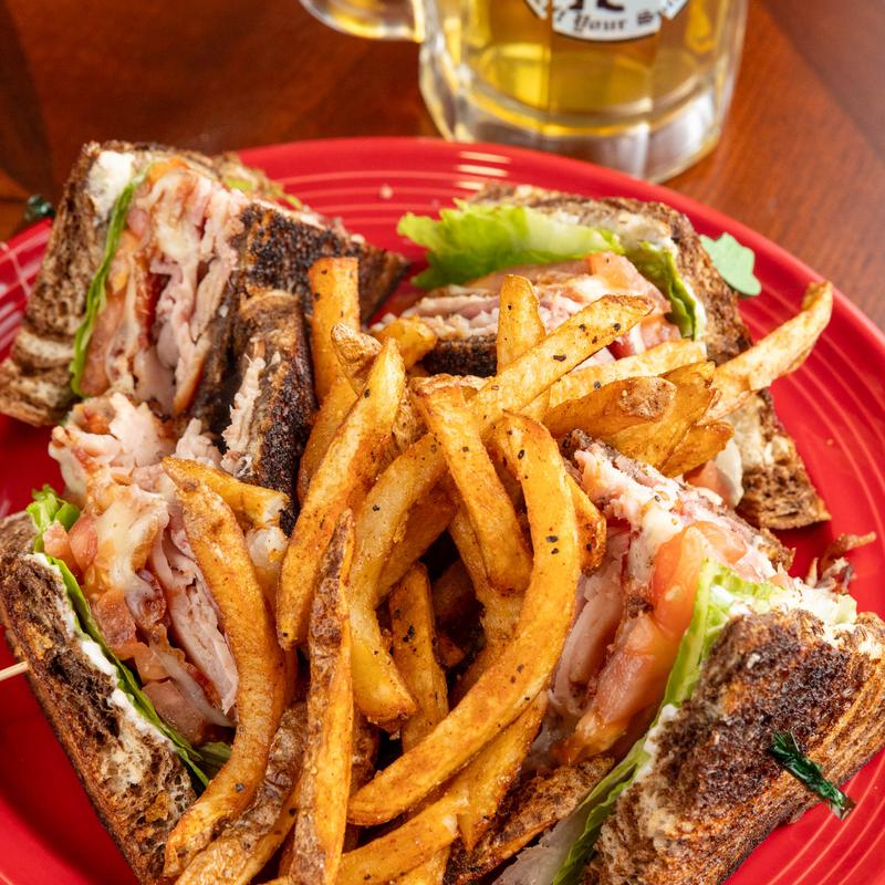 Stacked turkey, ham, bacon & Swiss cheese with lettuce, tomato & mayo on grilled marble rye
