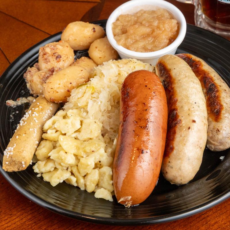 A taste of our three sausages on a bed of German sauerkraut, served with spätzle, German potato salad & a pretzel stick