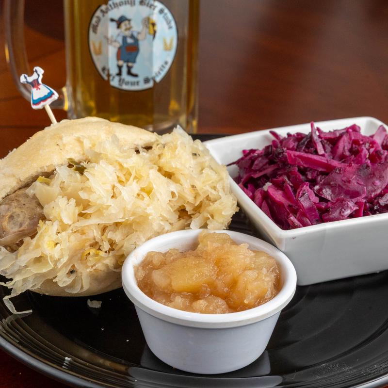 Served with German sauerkraut on a Brötchen roll with applesauce & choice of German potato salad or spätzle.