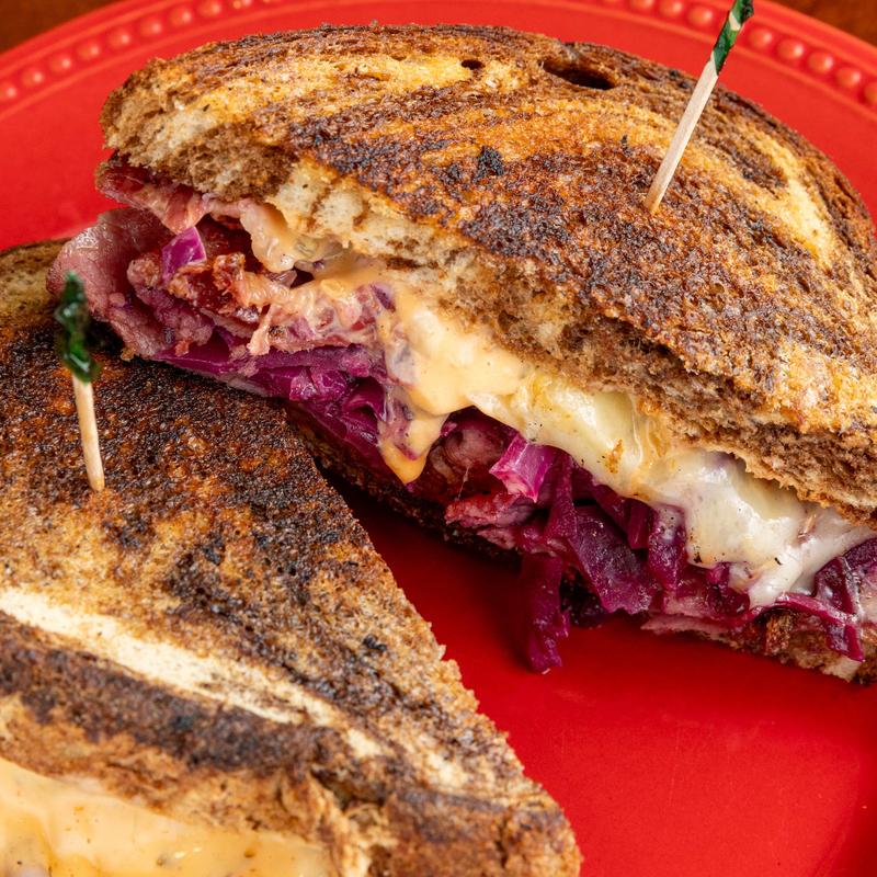 Sliced house-brined & roasted corned beef brisket, braised red cabbage, Swiss cheese & thousand island dressing. Or try the Rachel with turkey!