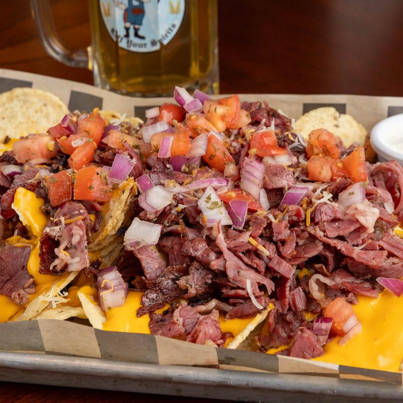 Hearty stack of crispy tortilla chips piled high with our house-brined & roasted corned beef brisket, our Bitburger bier cheese, pico, sour cream & a side of guacamole