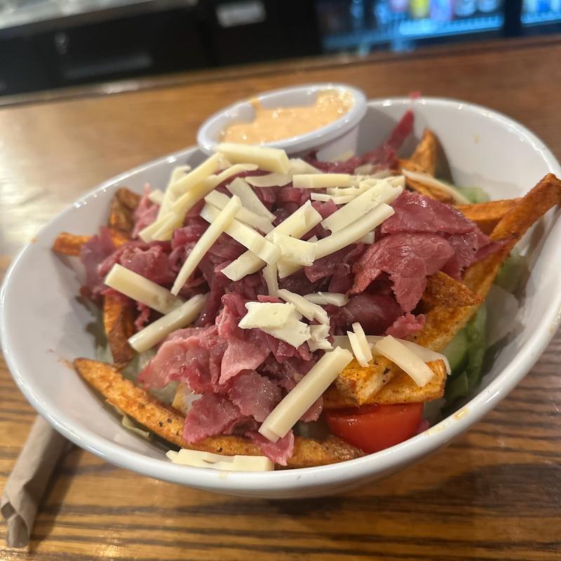 Greens, veggies, braised red cabbage, diced Swiss cheese & fries with thousand island dressing